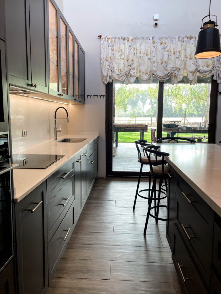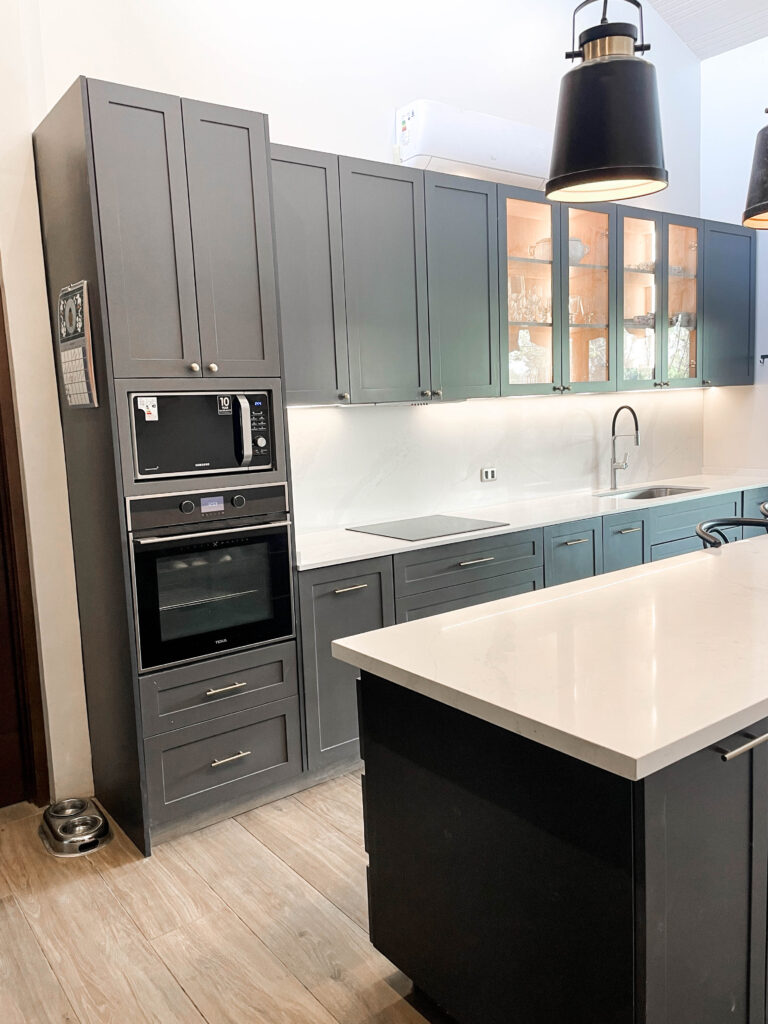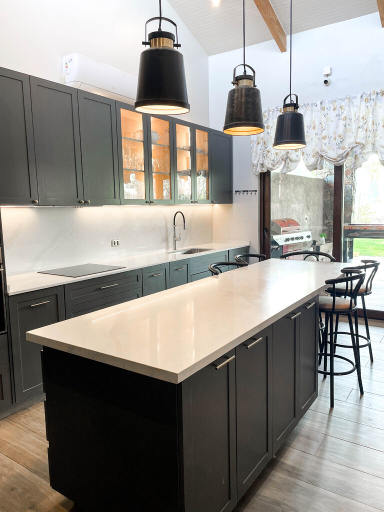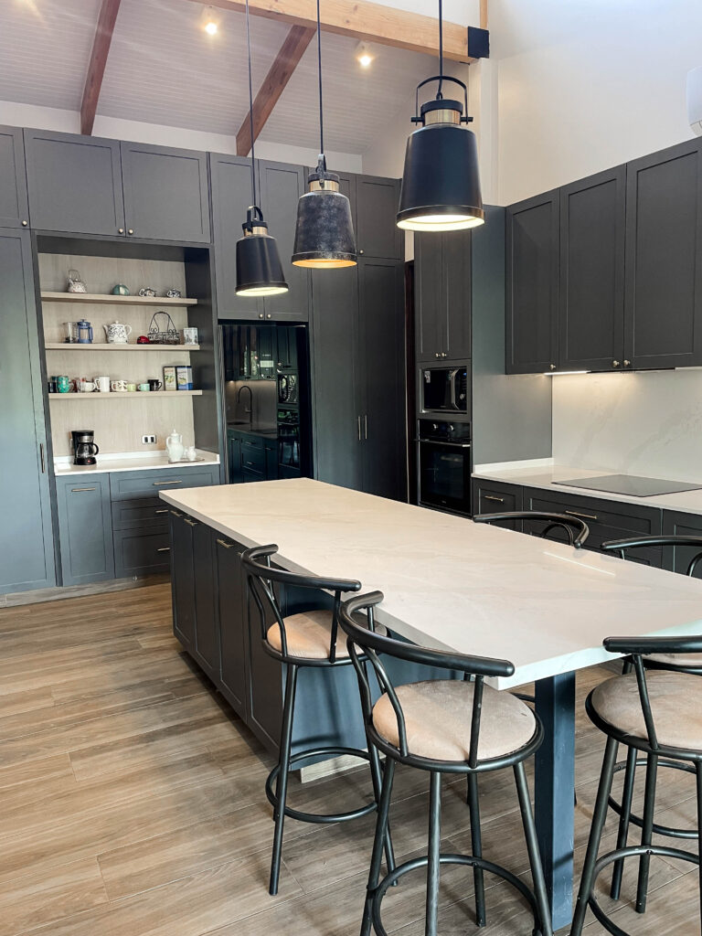 El diseño de los muebles para esta casa se basó en dos grandes requerimientos: aprovechar la gran altura interior para no desperdiciar espacio de guardado, y una gran isla central que sirviera como mesón de trabajo y comedor de diario. Fabricamos los muebles con estilo vintage, con puertas con molduras lacadas con productos Milesi, vitrinas iluminadas y la elección de una cubierta de cuarzo de color claro para contrarrestar el tono oscuro del resto de los muebles.