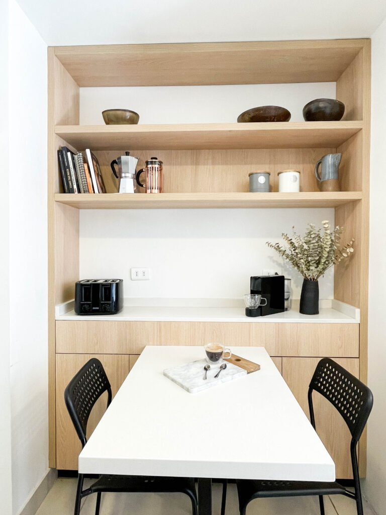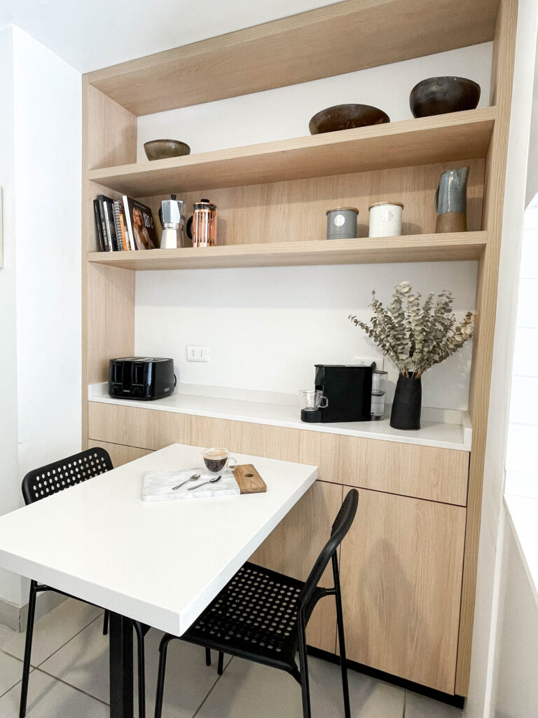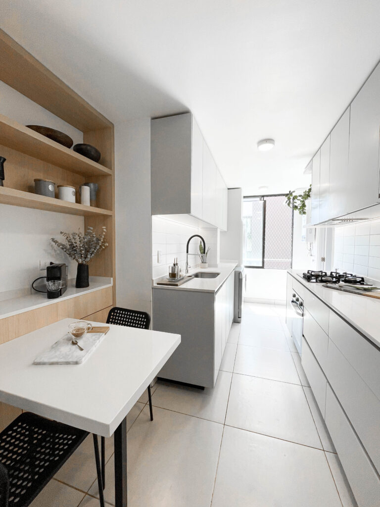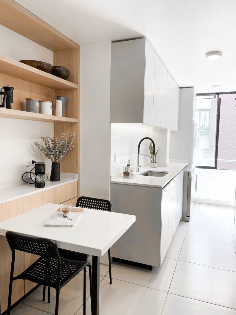 Otra buena estrategia fue transformar el antiguo espacio de refrigerador y despensa para hacer un mueble como nicho para desayuno, comedor de diario y espacio de guardado y decoración. El uso de colores claros es importante al momento de diseñar espacios reducidos para no provocar sensación de estrechez.