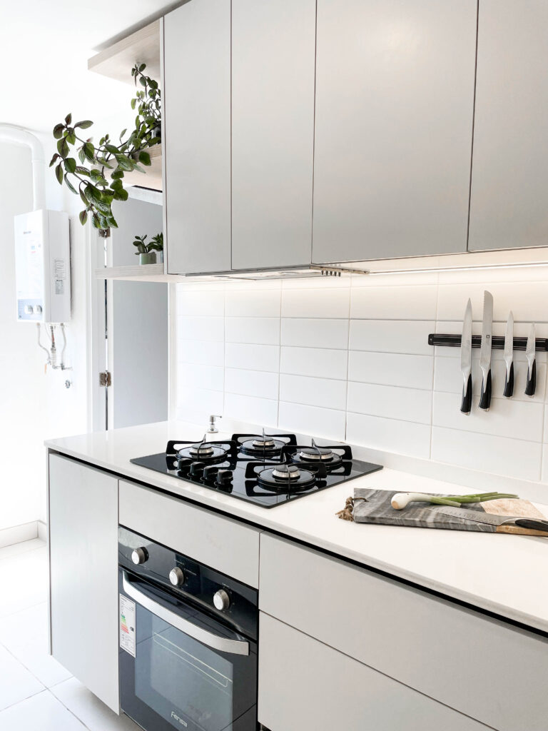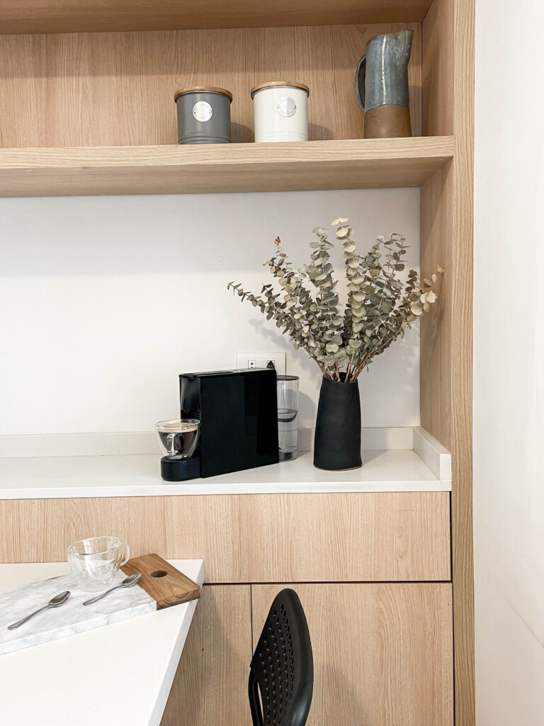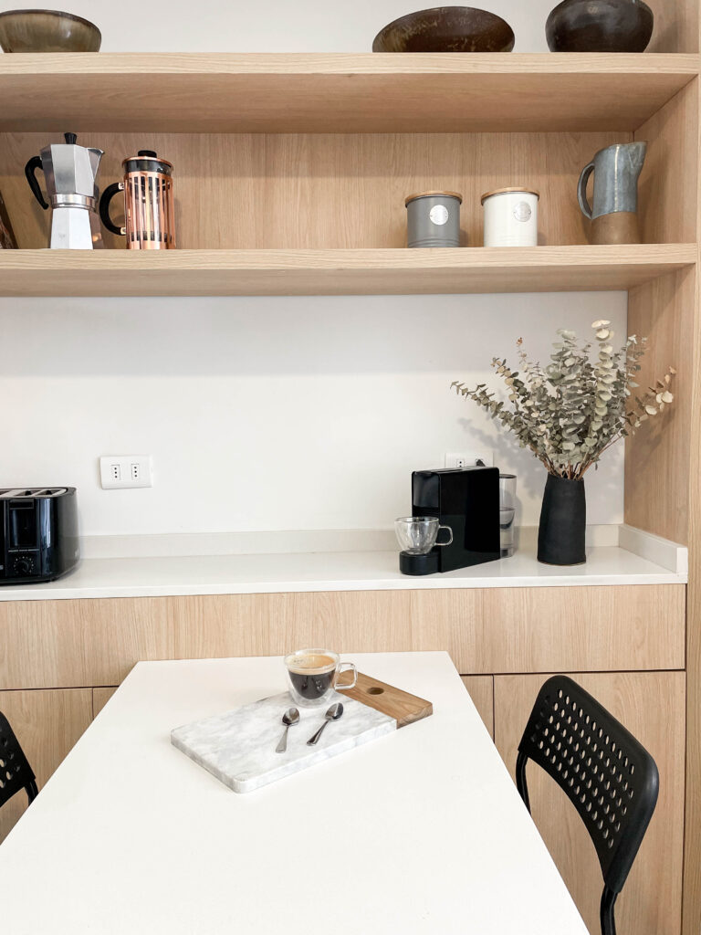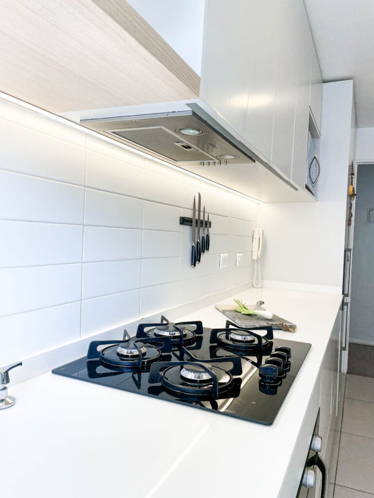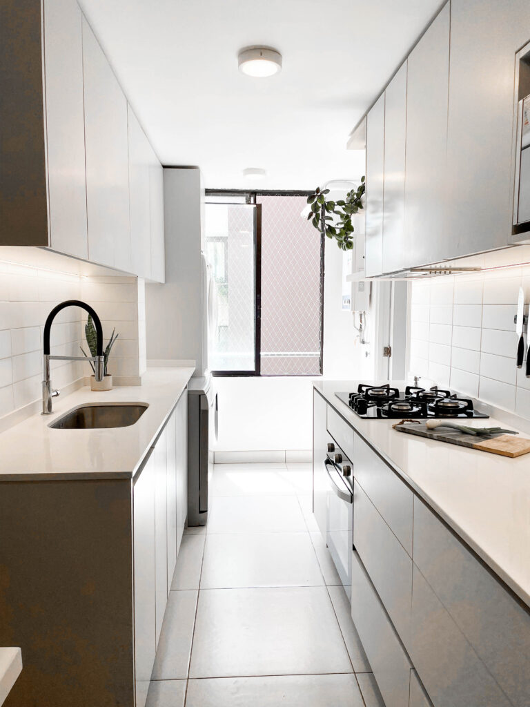 Otra buena estrategia fue transformar el antiguo espacio de refrigerador y despensa para hacer un mueble como nicho para desayuno, comedor de diario y espacio de guardado y decoración. El uso de colores claros es importante al momento de diseñar espacios reducidos para no provocar sensación de estrechez.