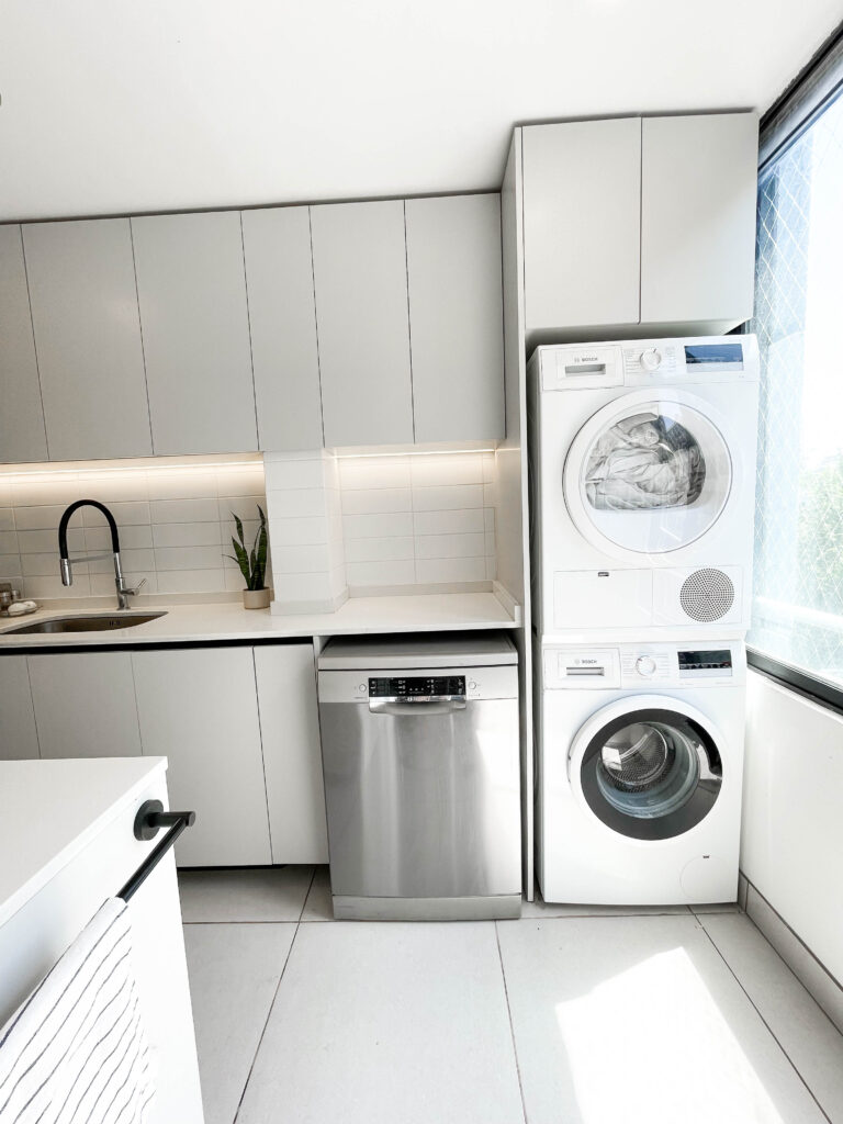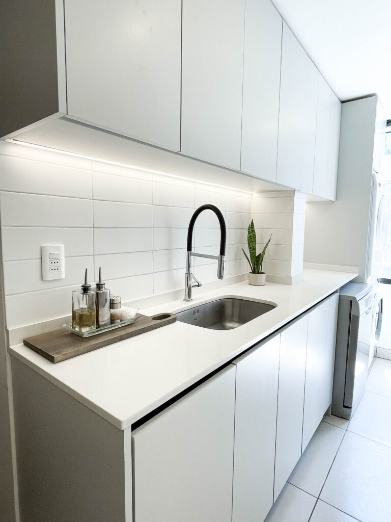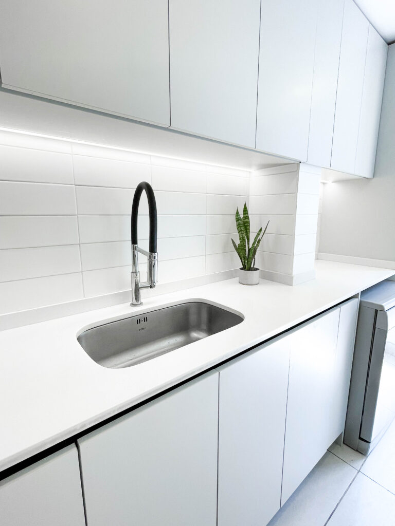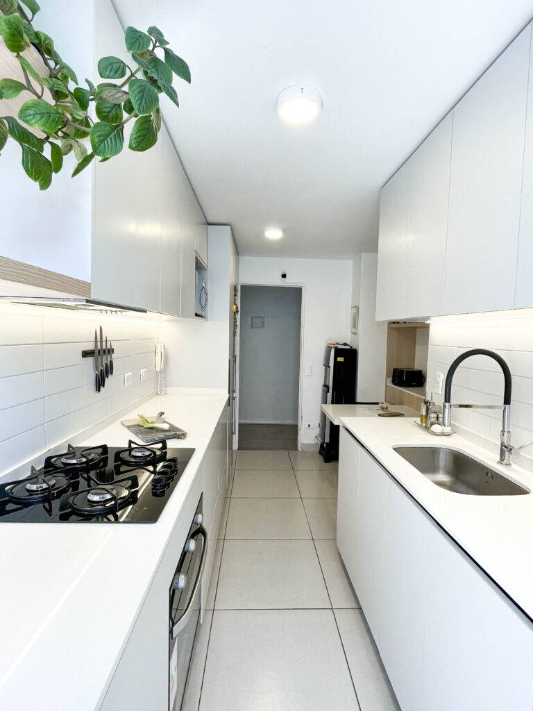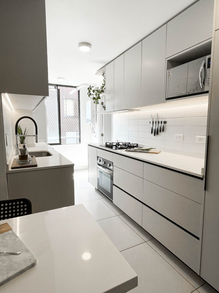 Incorporar la logia por pequeña que esta sea muchas veces aporta amplitud, ventilación y optimización de espacios al momento de remodelar una cocina, en este caso nos permitió extender la cubierta, dejar las holgado el acceso al dormitorio de servicio.