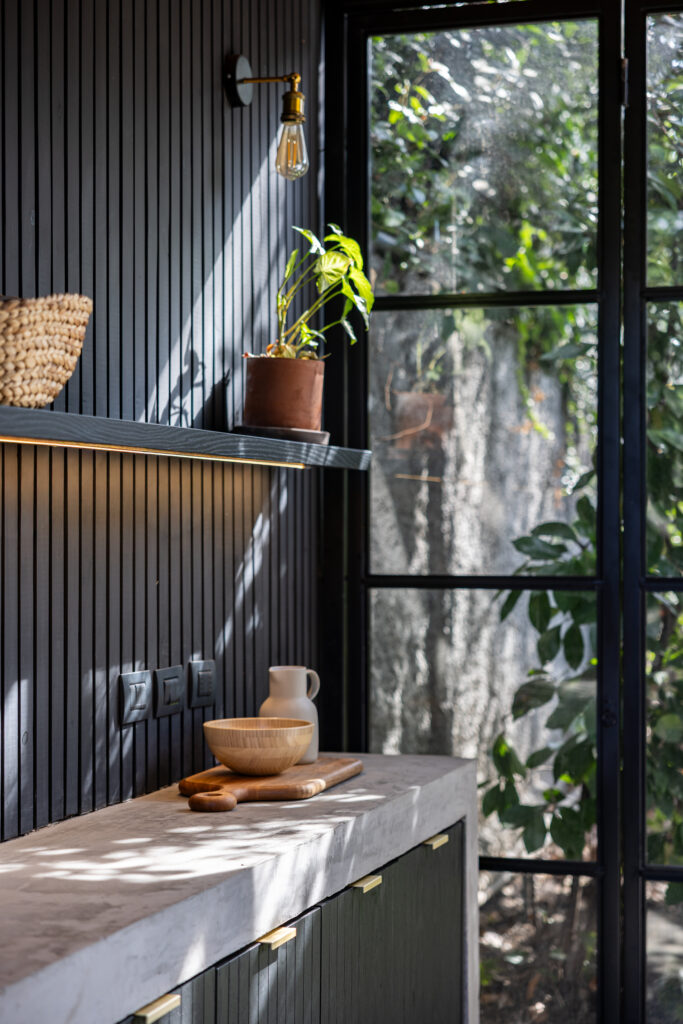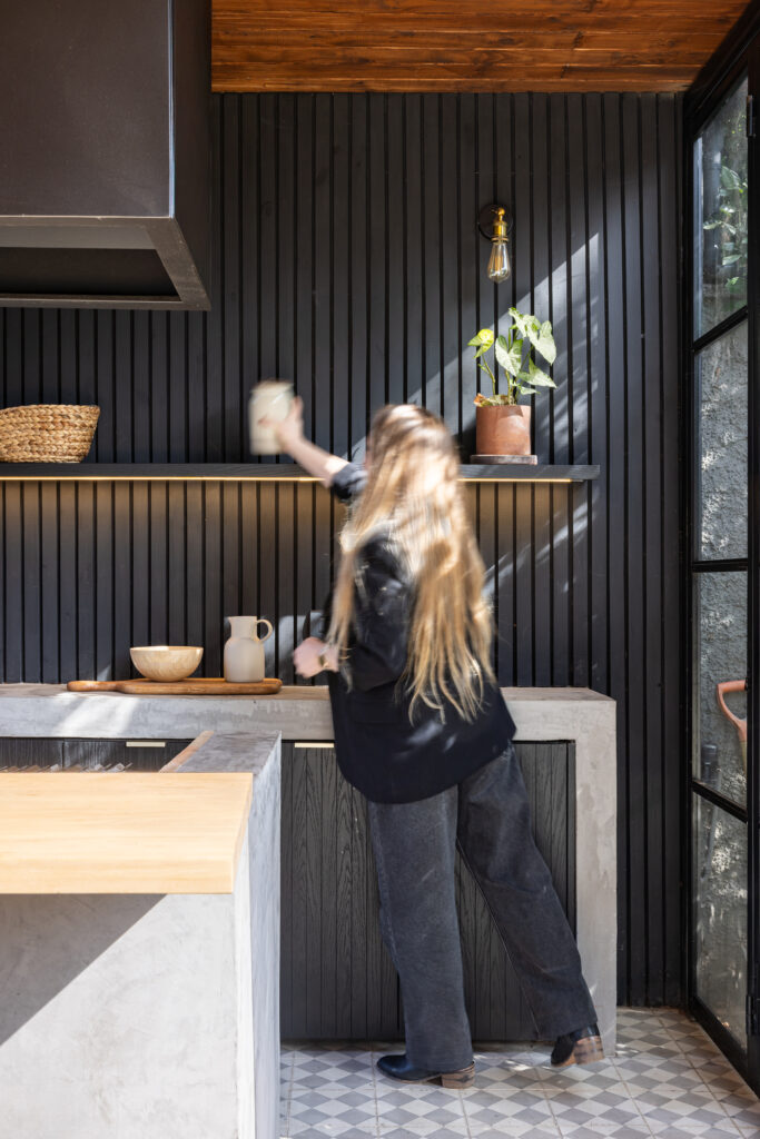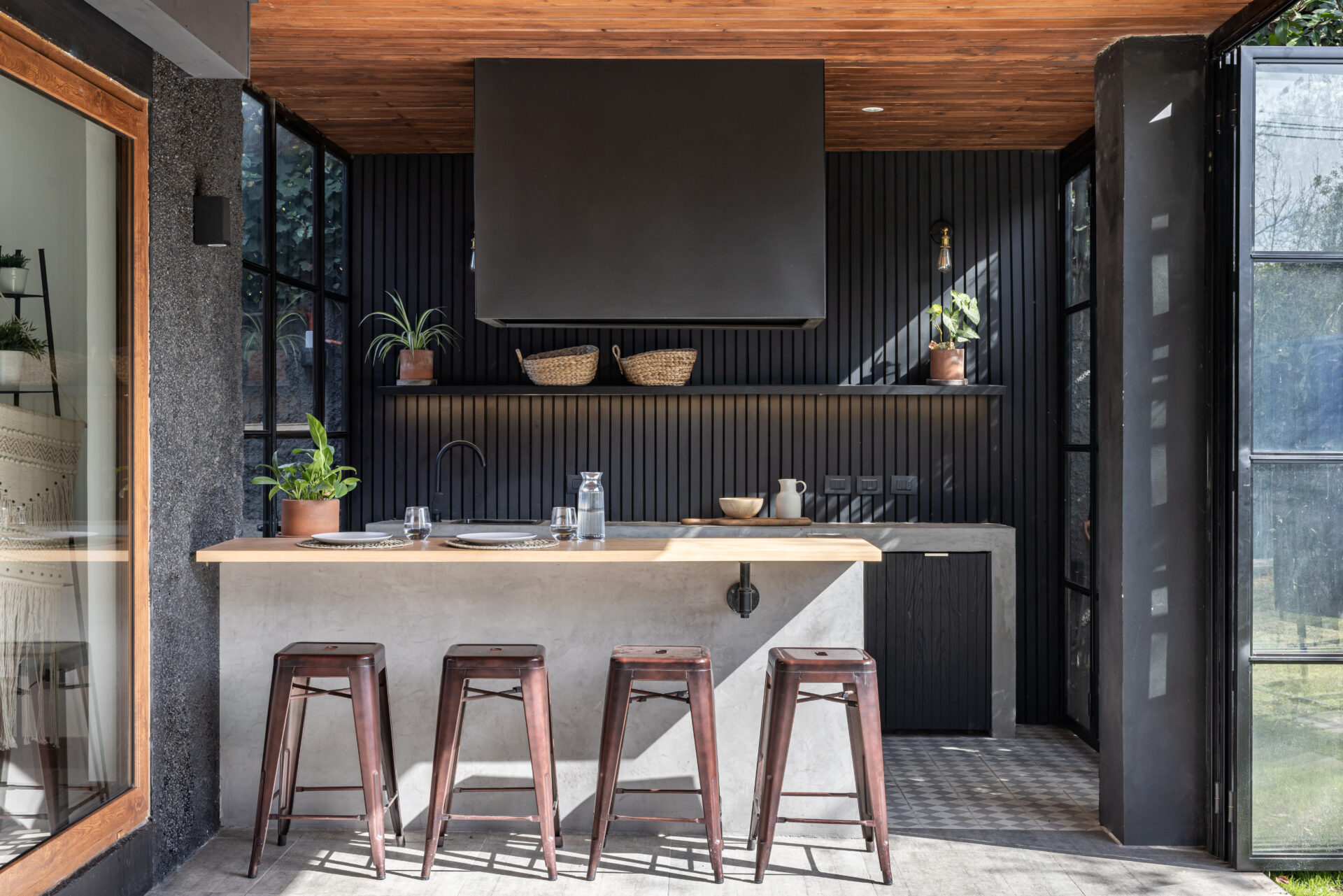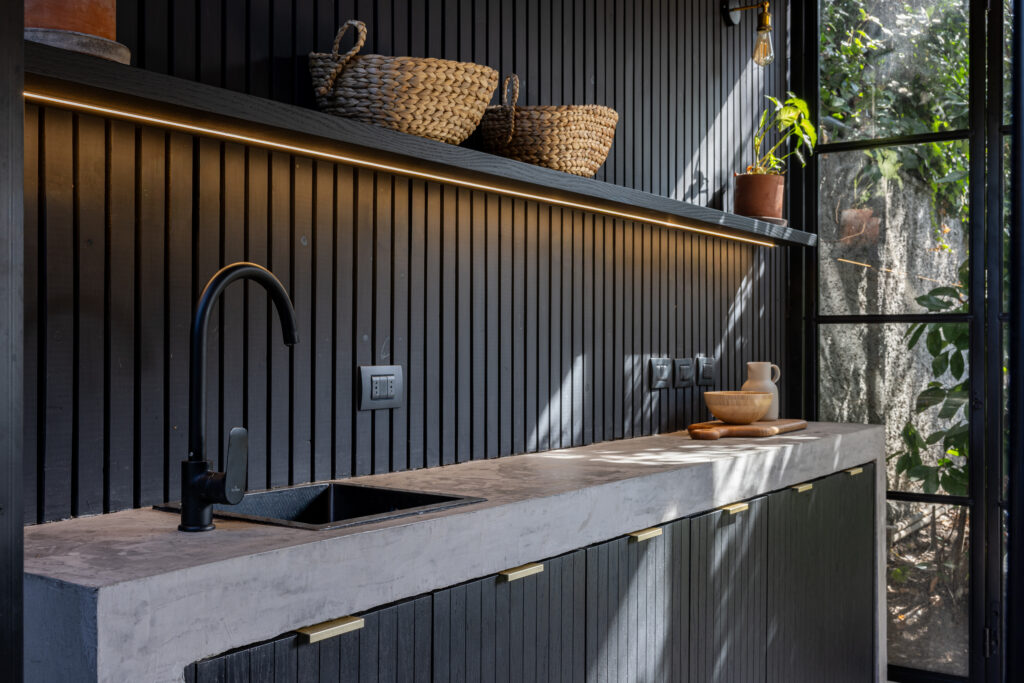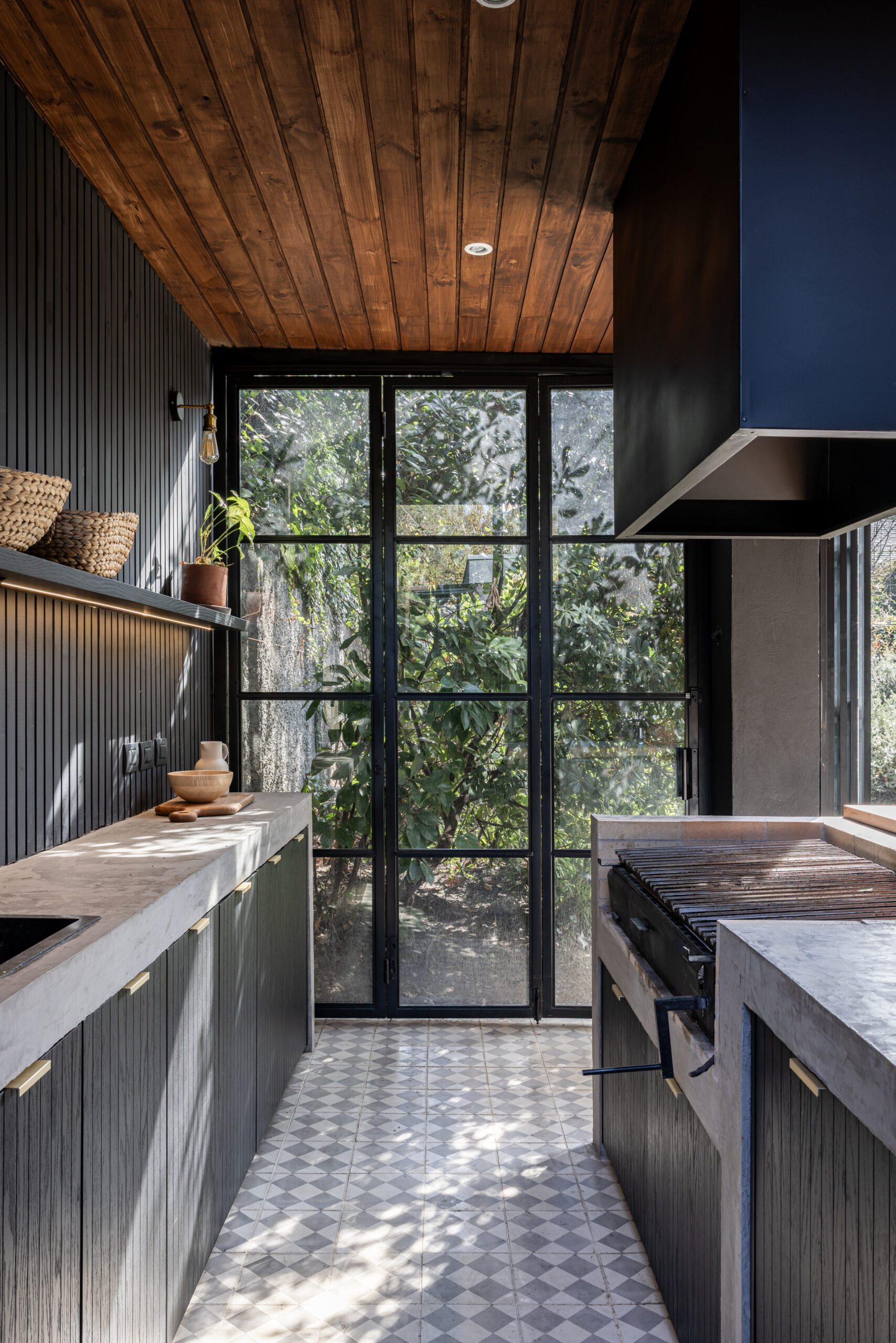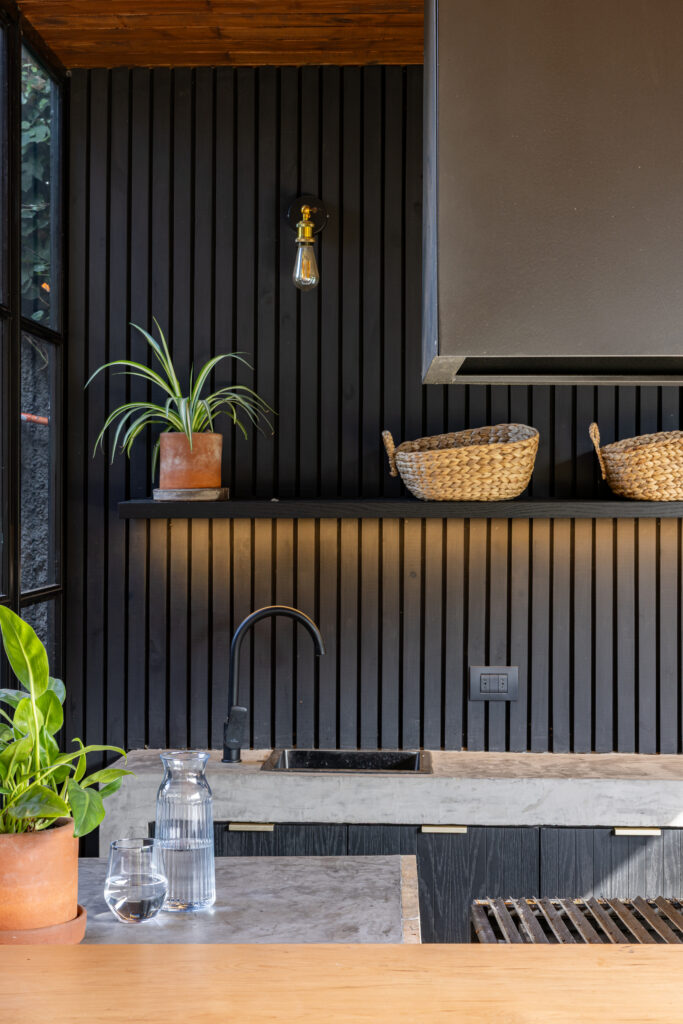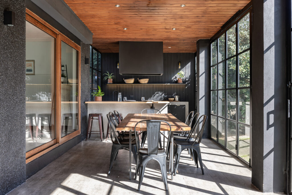 Para muchos, el mejor espacio de la casa. Extendimos la terraza hasta el muro perimetral y propusimos un mueble tipo isla para que el parrillero pueda disfrutar integrado junto a sus invitados. Además, una barra de madera de lenga para disfrutar una copa de vino junto al anfitrión. De fondo, un mesón de apoyo con lavacopas y espacio de guardado para tener todos los utensilios, accesorios y juguetes para la parrilla.